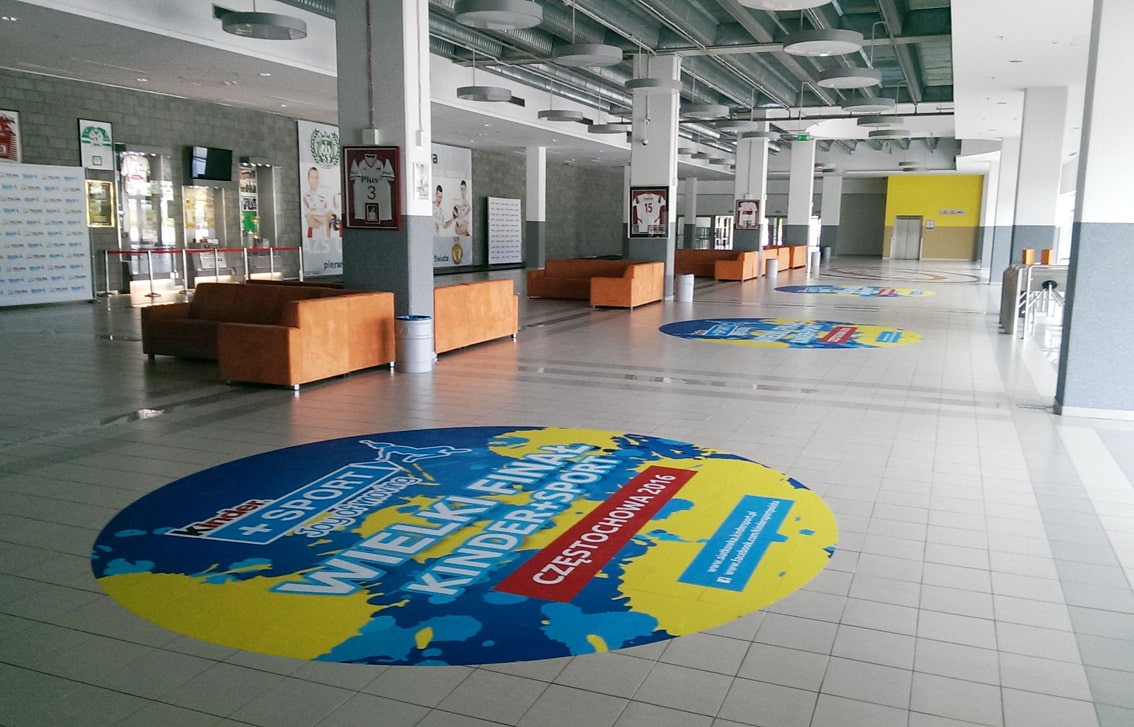 Naklejki z laminatem podłogowym na imprezy sportowe i eventy.